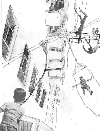 The study of the modernist film, Les Miserable (2019), became a forensic lens which focused my gaze upon post-war modernist architecture in London and comparing its notions to the neglected town of Clichy-Sous-Bois. Choreographic drawings based on the film evolved into the interrogation of social housing estates in London and the relationships the residents of the estates have with their exterior. The challenge addressed is the removal of restrictions imposed on the site, in order for the residents to enjoy their exterior without limitations. The intervention makes use of the space above the ground of Nelson Square Gardens, encouraging the people to enjoy their domestic activities in the open air.